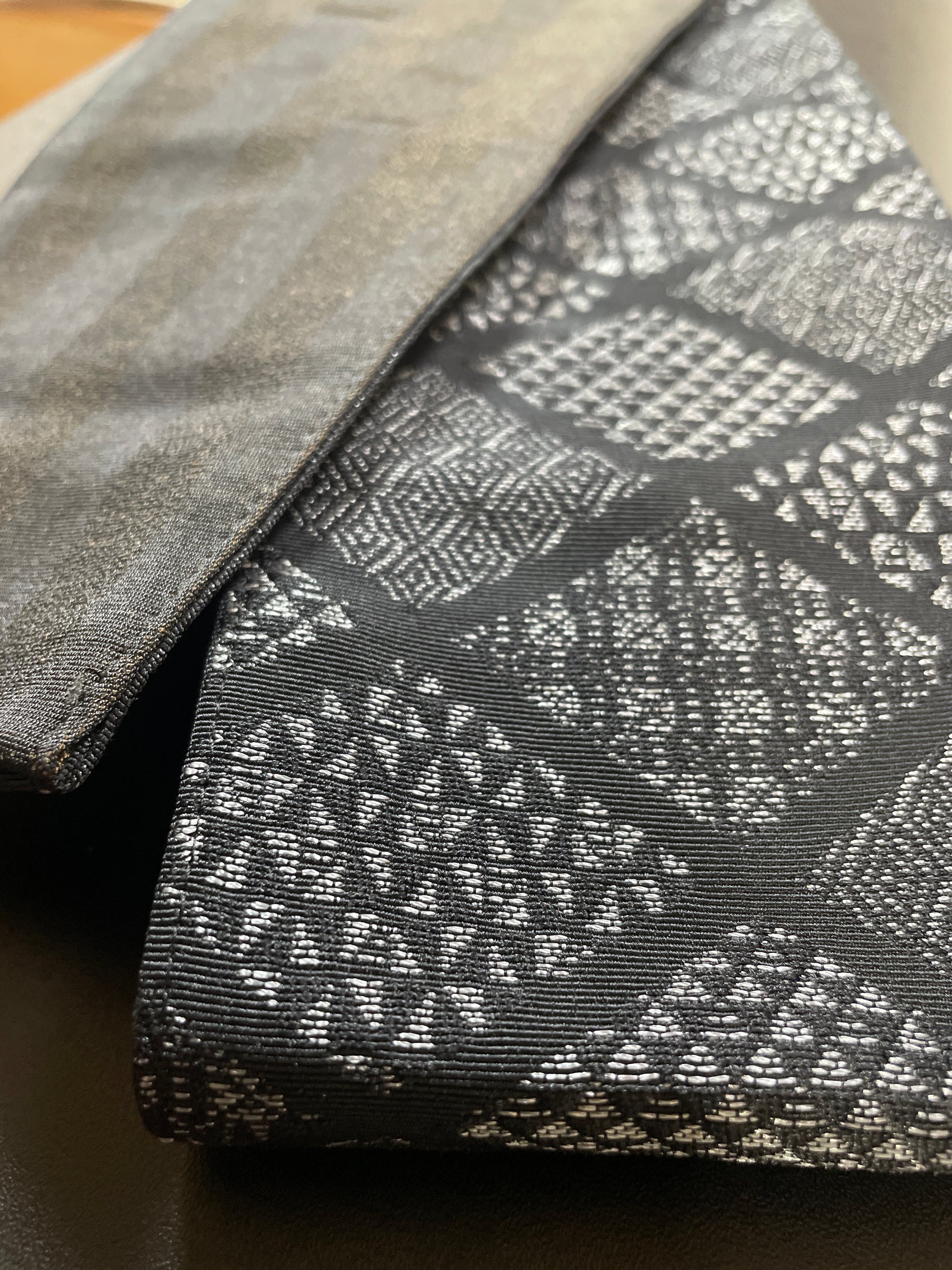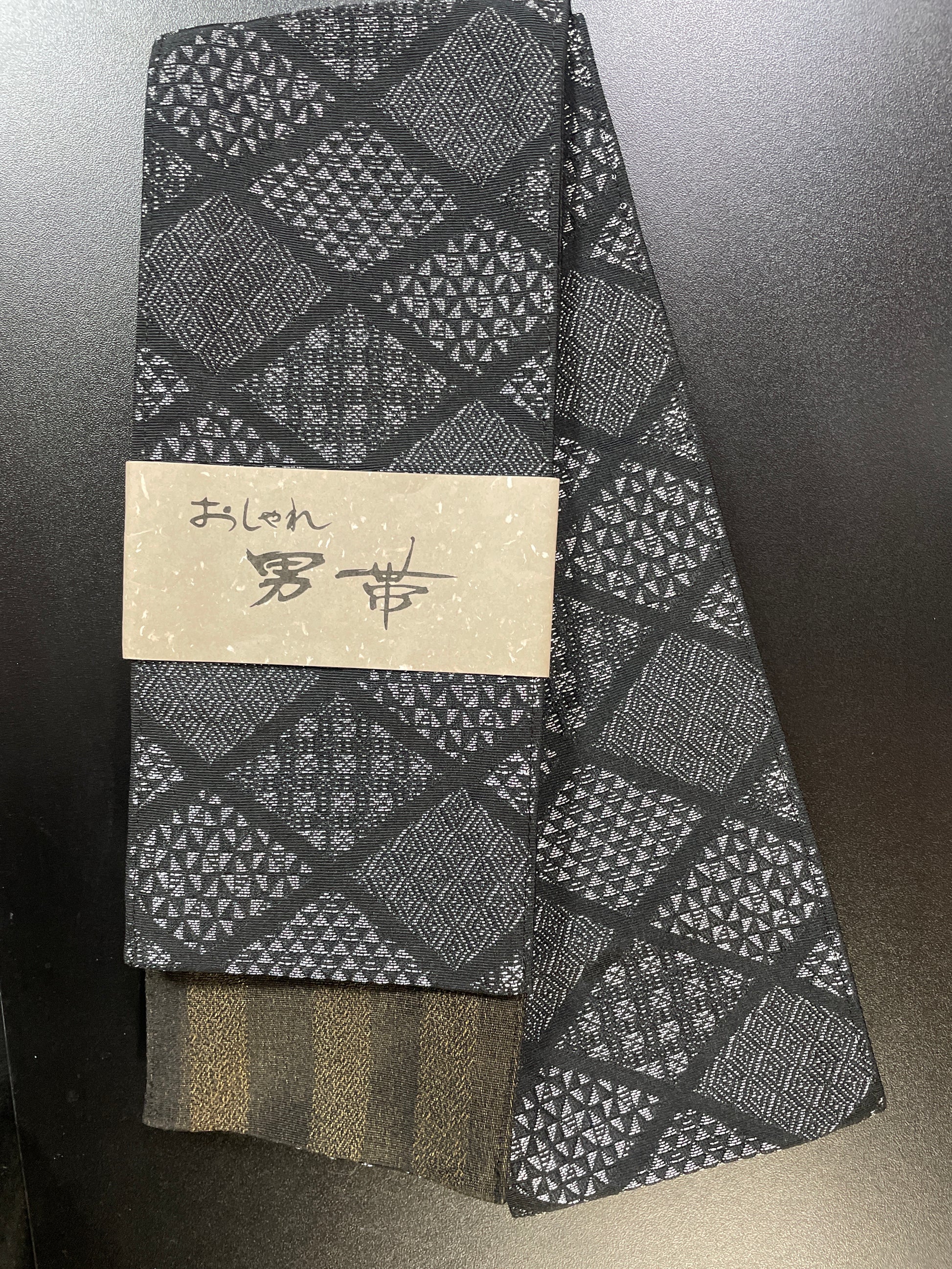 オシャレな男性用帯です。黒地に銀糸で彩られた幾何学模様がインパクト大。