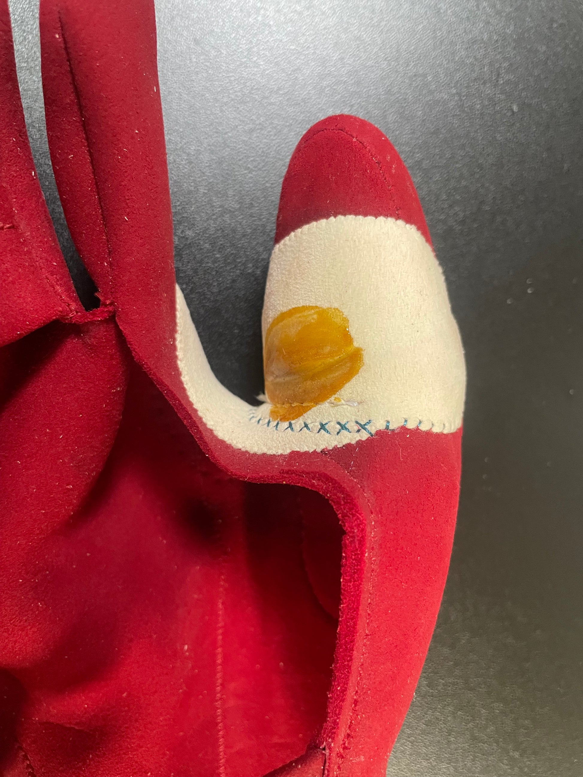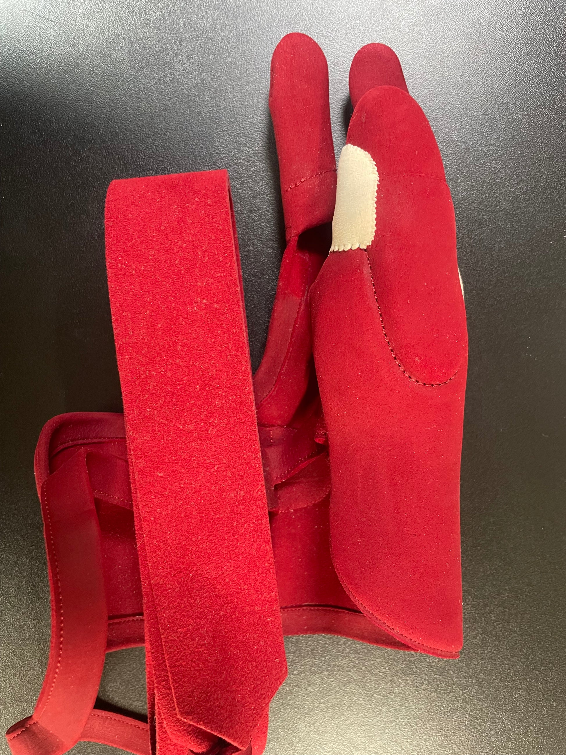 束離、上革、縁エンジ、本体エンジ、両面染め、七分縁。