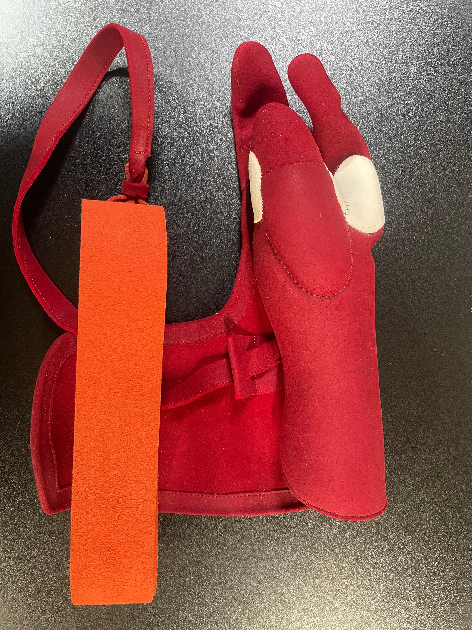 束離、上革、縁エンジ、本体エンジ、両面染め、七分縁。