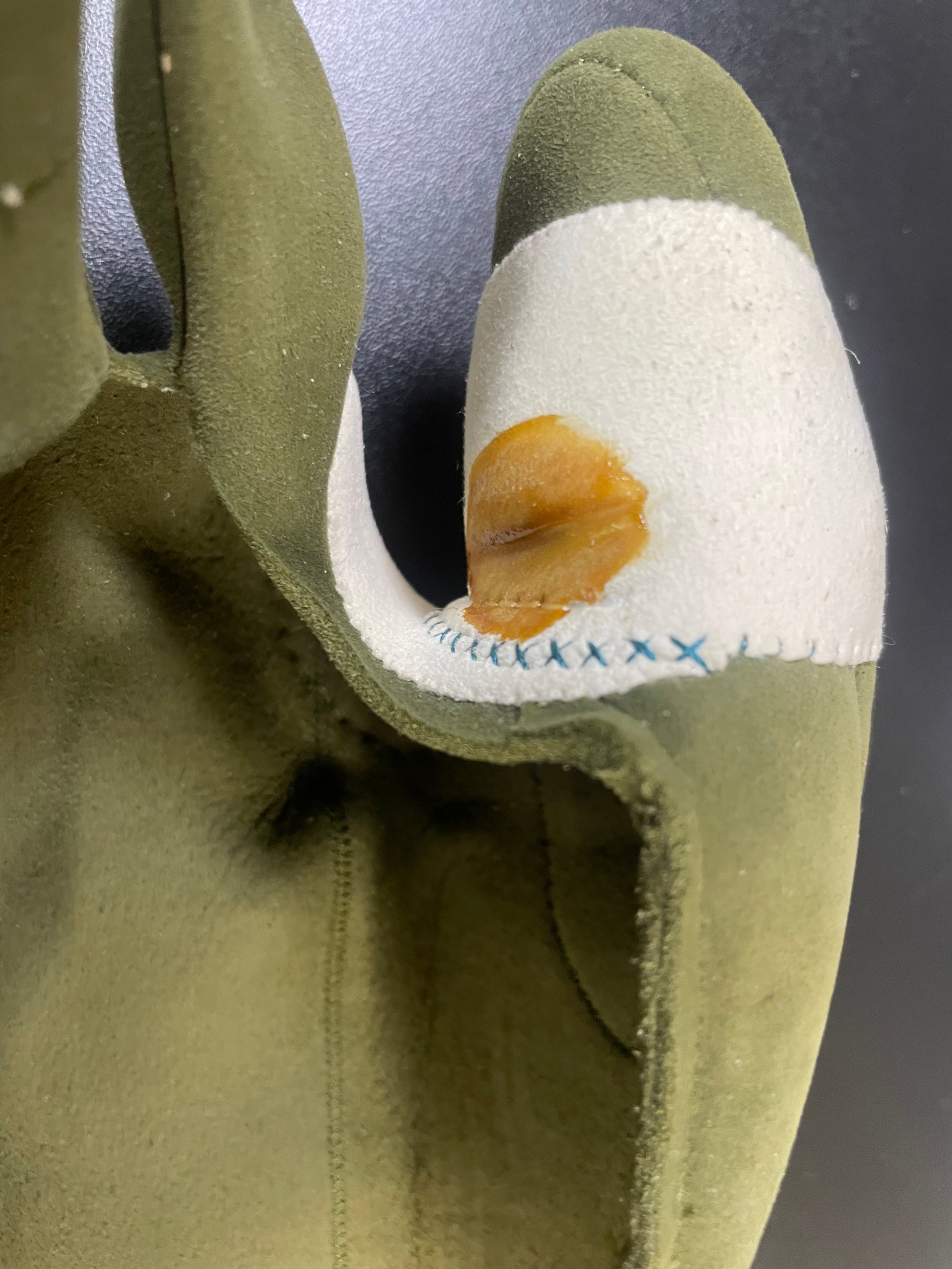 束離、上革、縁鶯、本体鶯、両面染め、七分縁。