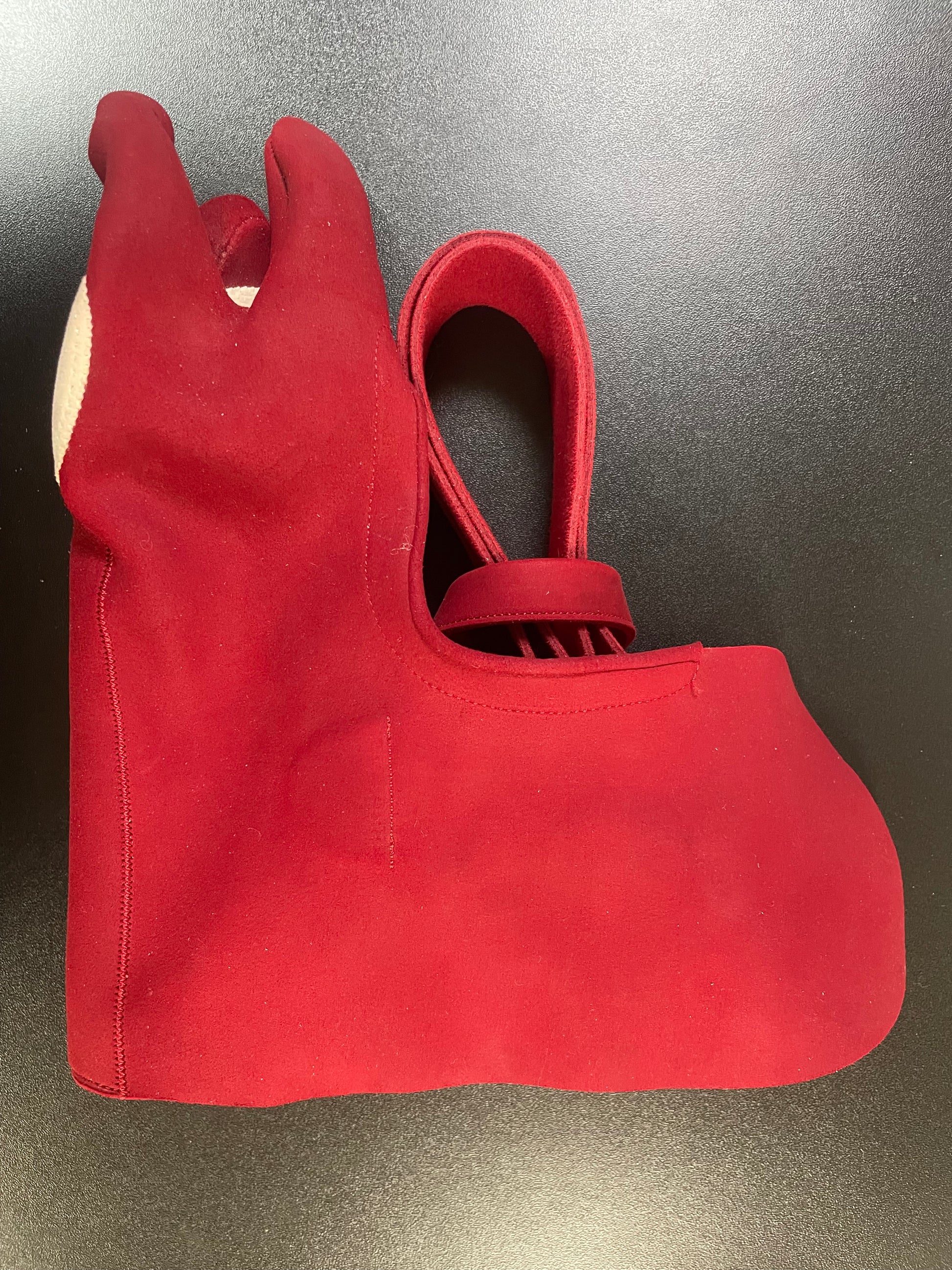 束離、上革、縁エンジ、本体エンジ、両面染め、三分縁。