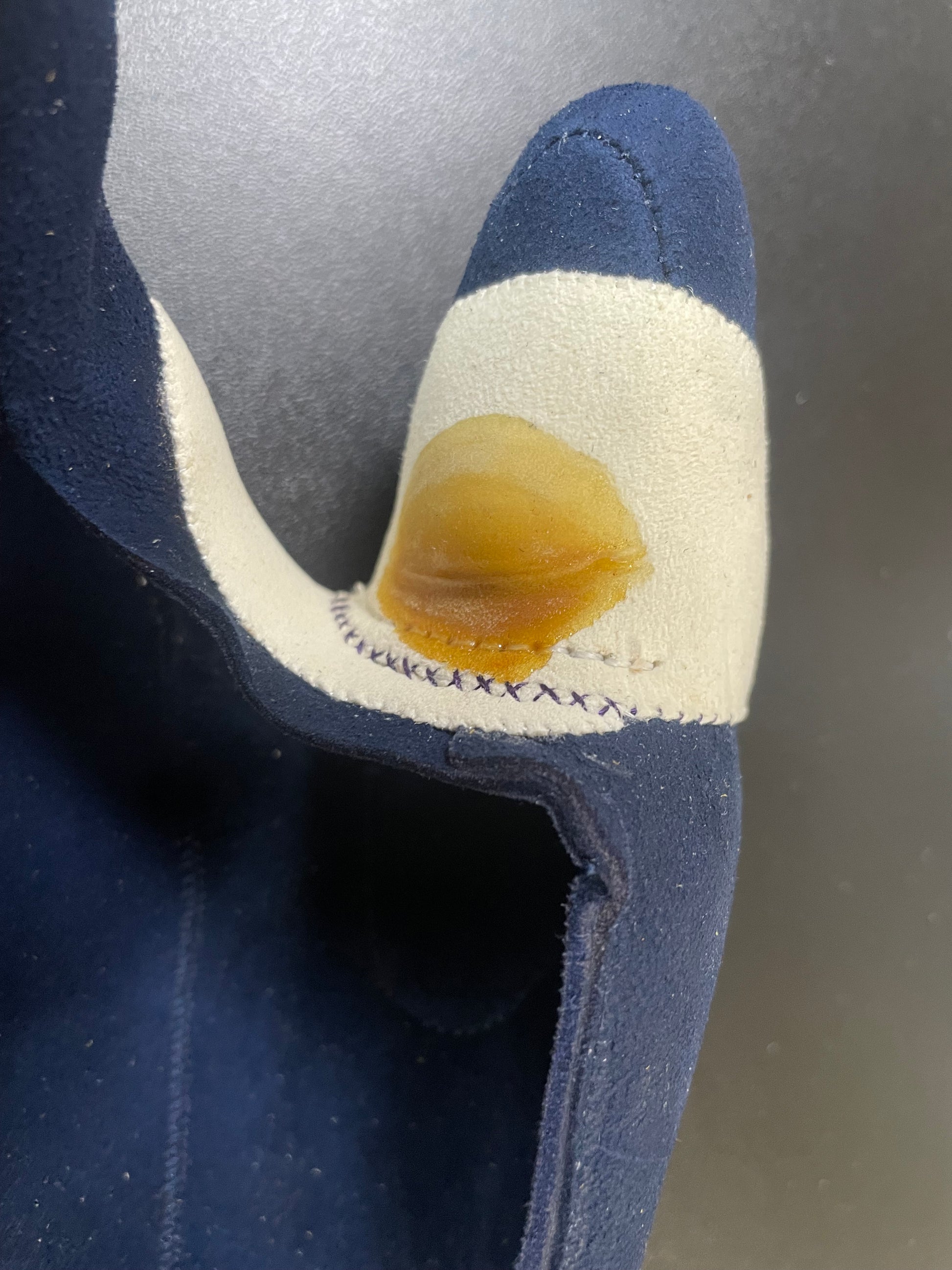 縁は七分縁明るい金茶、本体台皮紺、添え指紺。帯幅普通・エクセーヌ・紺。