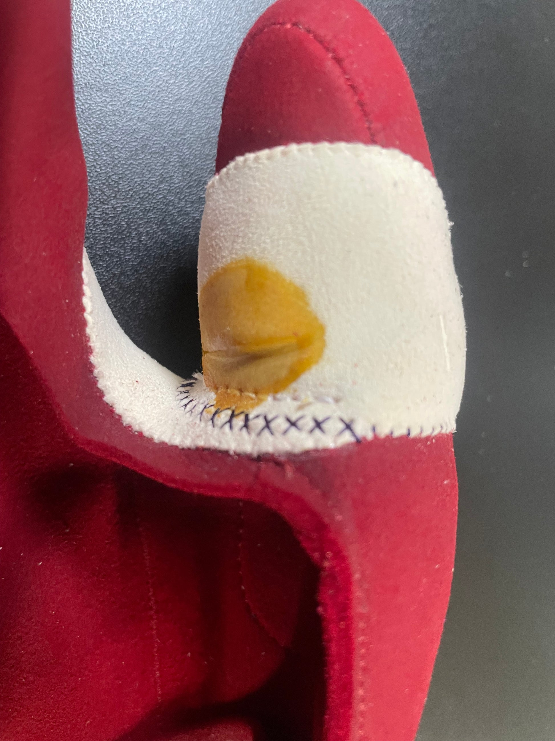 束離、上革、縁エンジ、本体エンジ、両面染め、七分縁。
